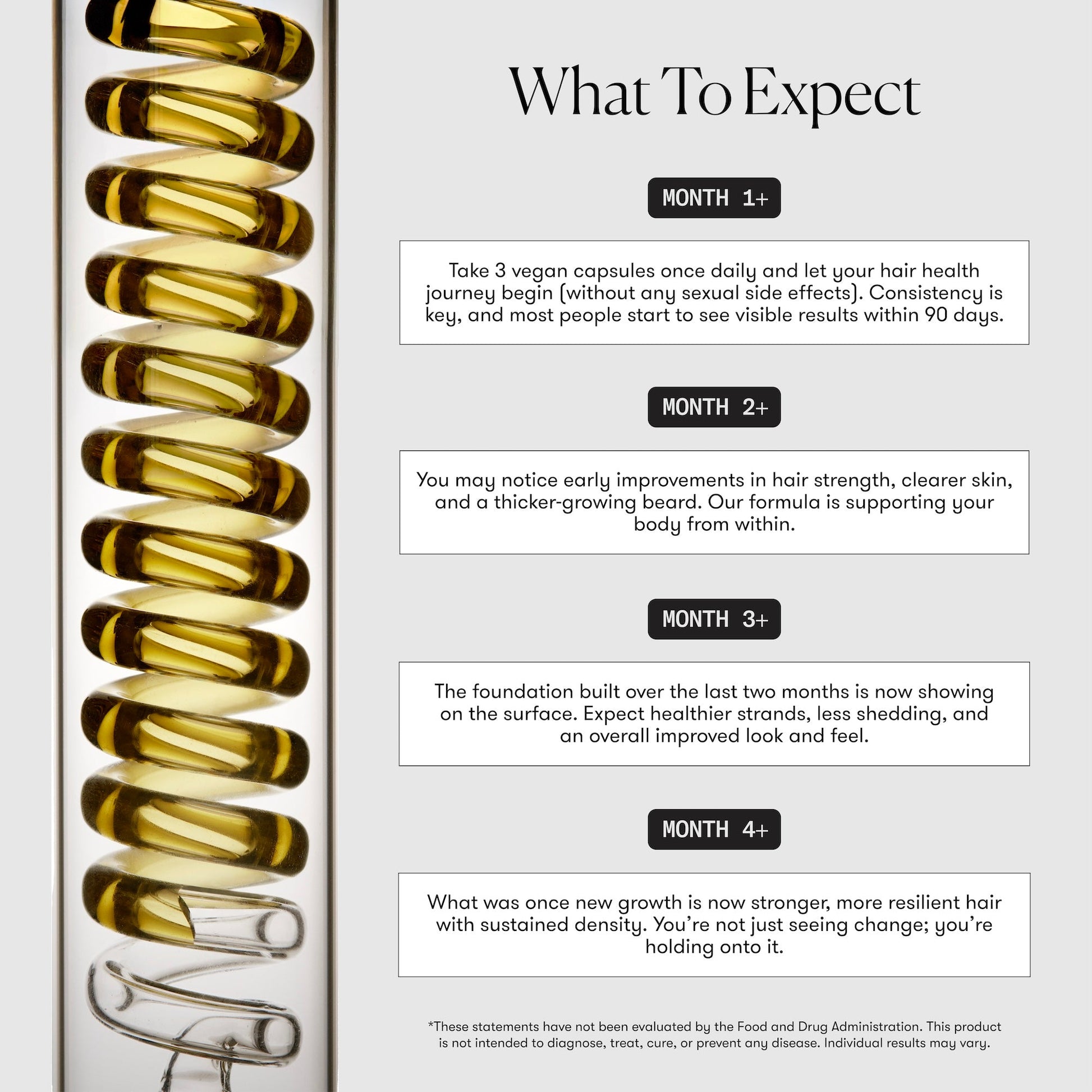 Take 3 vegan capsules, once daily, and let your hair journey begin! Consistency is key—visible results typically appear within 90 days.